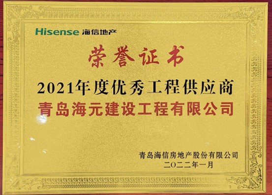 近期,青岛海元建设工程有限公司被评为“2021年度优秀供应商”称号,是海信集团对青岛海元建设工程有限公司优质产品和服务的高度认可。